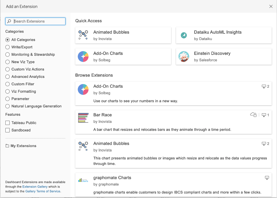 With the in-product Tableau Exchange, all your connectors and extensions are a simple click away. Easily discover connectors and extensions with an enhanced browsing experience, search and filter options, and complete the installations all without leaving your Tableau workflow.