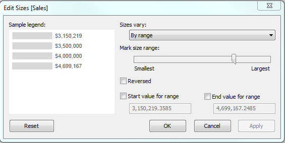 This will cause my bars to start looking like a bar chart. To get the bars to push from one end of my chart to another, I will double click the Size legend (located below the marks card), select “By range” from the drop down on the right side of the size window, and slide the mark size range slider to the largest size allowed.