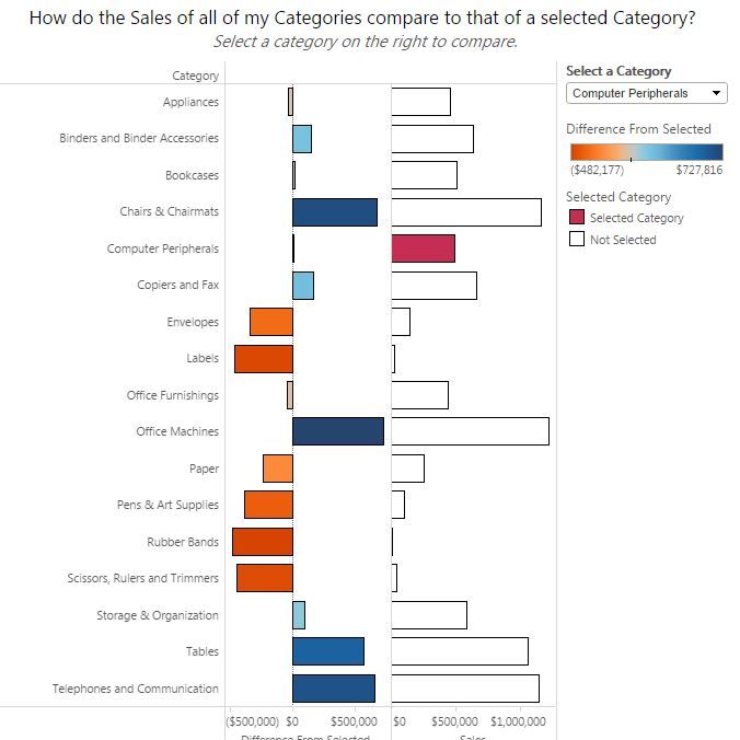 valuable use cases such as comparing a section of our regions/items/employees to all others. The following example walks through how to compare a selected category to all of the other peer categories, which makes it easy to see how they are doing relative to each other.