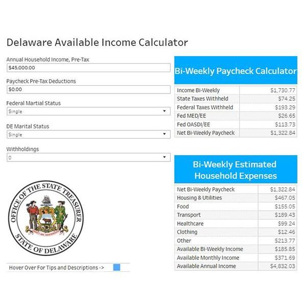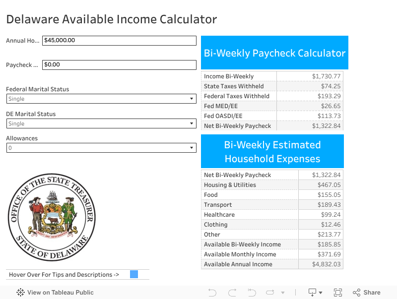 The state of Delaware has taken on the challenge to provide financial education to its residents by offering an easy way for them to determine available income. State Treasurer Colleen C. Davis released an interactive Available Income Calculator, built in Tableau Public, that any Delaware resident can easily access and use to determine fixed expenses, average monthly expenses, and the income available after necessities are paid for.