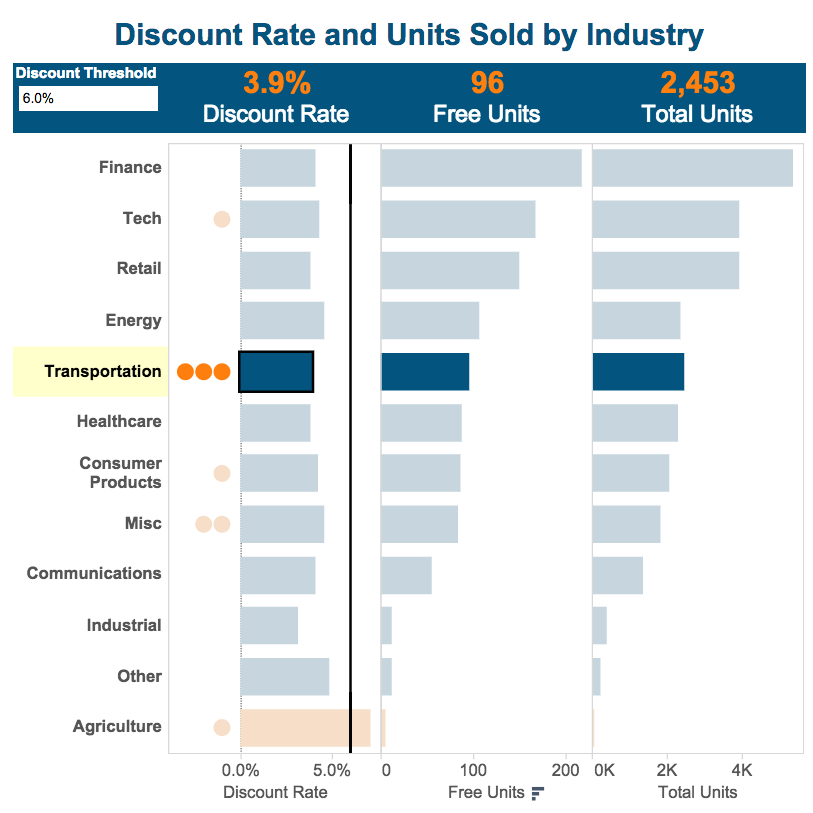 The orange dots surface this detail, with the number of dots indicating the number of customers receiving discounts above the threshold. You can immediately see that there are three issues in the transportation industry, and clicking on a bar will filter to the customer detail view.