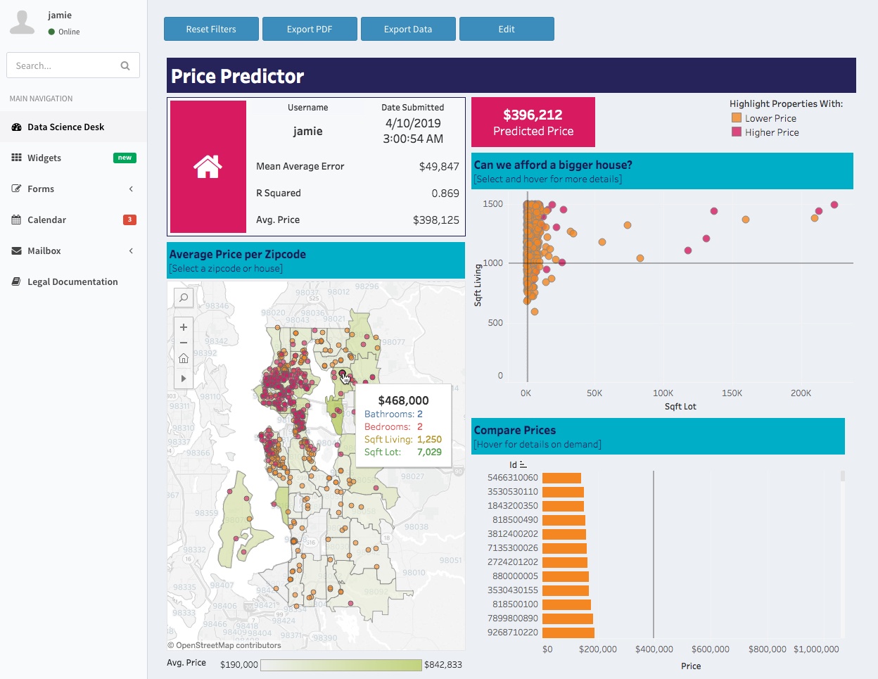 Advanced, predictive analytics can help users forecast housing costs based on market trends, using Tableau embedded analytics within a real estate application.