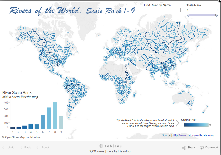 "I’ve recently been geeking out on maps and shapefile data using the Natural Earth Data site along with the handy “Tableau Shapefile to Polygon Converter” by Alteryx. It used to be very difficult to convert shapefiles into Tableau custom polygons and polylines, but now it’s easy. I used these two sites in tandem to create fun and interesting maps showing roads, rivers, railroads, airports, and even alternate map projections. The map showing the world's rivers is shown below.”