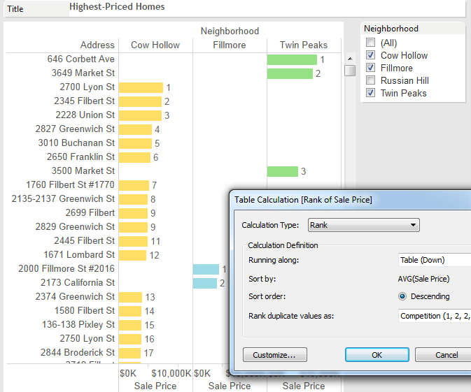 Ranking got easier as well in Tableau 8.1. It's now a table calc as well, with the option to change from competition to dense ranking. This time we're looking at sales over several years in three San Francisco neighborhoods. The most expensive homes are ranked independently in each neighborhood. In Cow Hollow, the 9th most expensive home was tied with another-- so both get the rank of 9 and the next home is ranked #11, according to the competition ranking system.