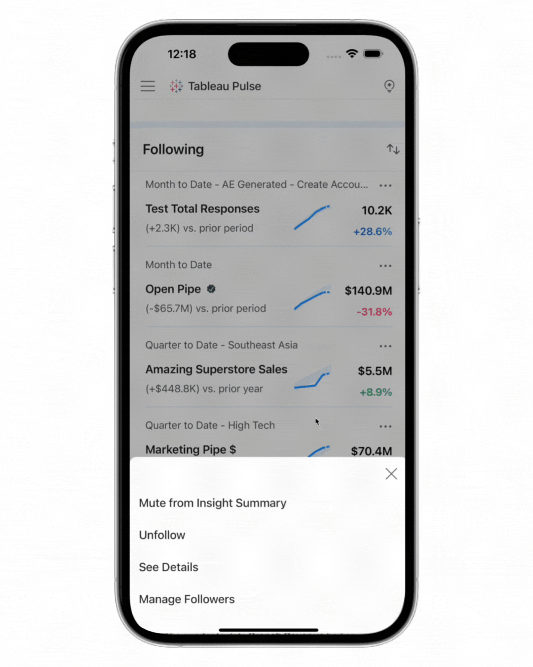 Pulse on Tableau Mobile now better matches web functionality around the most common Pulse interactions. Select the ‘filter’ dropdown to change the time period for a metric when browsing your metrics on mobile—without needing to switch to the web to explore.