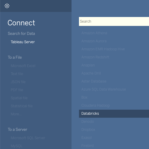 Prior to 2019.3, connecting to Databricks was possible through the generic Spark SQL connector in Tableau. Accessing your data via the generic connector was possible, but the overall experience and performance needed improvement. Now, when you click on the Databricks Connector, you’ll receive a simplified dialog, a faster initial connection, and noticeably faster loading times.