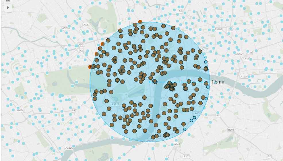 Googling then revealed that there is actually a common definition for the centre of London which is used in mapping when calculating distances in miles to London. It is the Charles 1st Statue in Charing Cross. With the help of the new radial lasso tool, I then redrew my selection to create a circle of points around the Charing Cross roundabout, to a finger-in-the-air radius of about 1.5 miles (Editor's note: notice the new distance read-out with the radial select map tool! This is a early release to Public of a Tableau 9.1 feature that applies to maps at zoom level 8 or higher.)