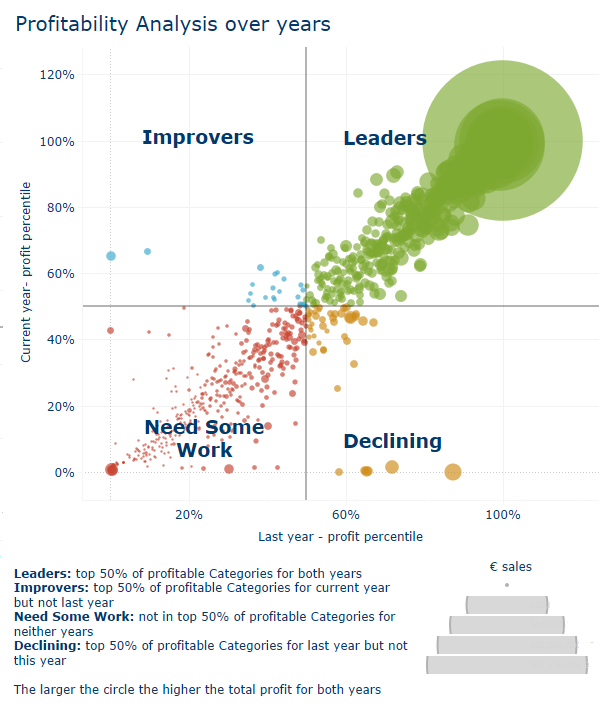 Mit diesem Streudiagramm verfolgt myToys die Entwicklung einzelner Katgorien im Vergleich zum Vorjahr.