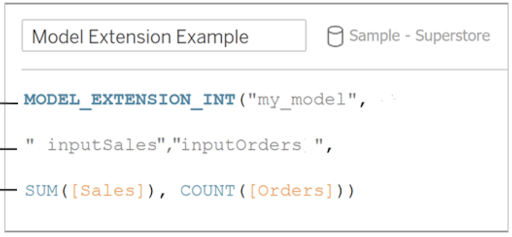 If we use Python (TabPy) for our analysis, we can use model calculations to directly query external analytics models, rather than writing lengthy calculations into a script function. Once we have deployed a model in our external analytics service and ensured the external analytics service allows for direct queries of that model, our Creator only needs the name of the model and the model inputs to create a calculated field for the model in Tableau.