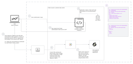 - The user authenticates into the application where Tableau content (e.g., a view) is embedded