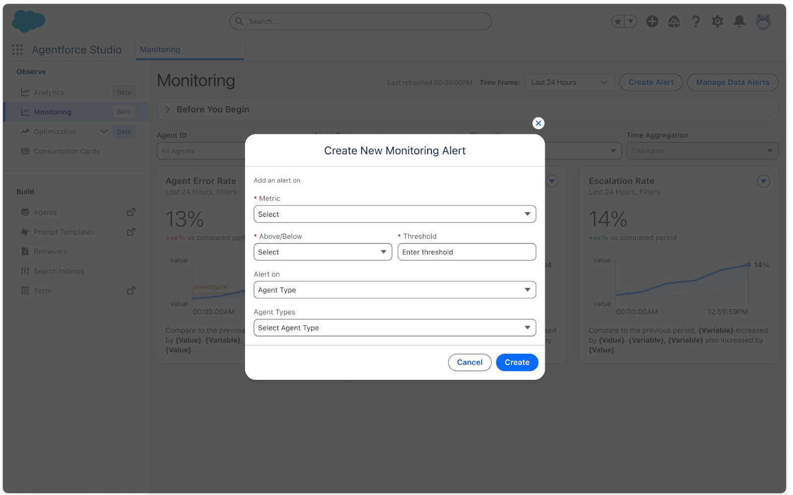 Gain near real-time visibility and trust signals on your deployed AI agents through proactive data alerts on agent performance. Set alerts and receive notifications to get ahead of potential agent issues.