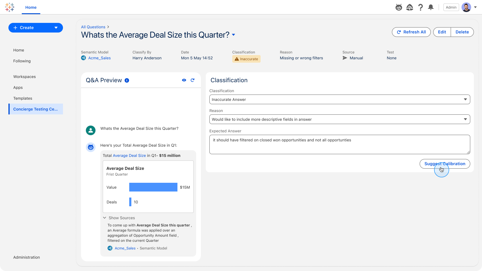 Improve your agent's accuracy on analytics questions with Q&A Calibration. Test responses against a set of questions, classify them as accurate or inaccurate, and apply guided suggestions to calibrate and verify answers.