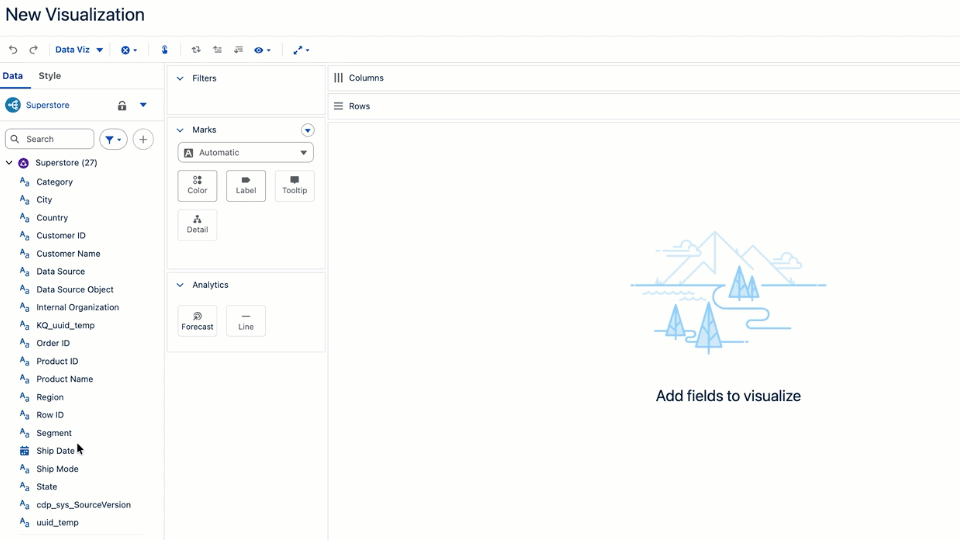 Increase your authoring efficiency with new productivity shortcuts. Double-click data fields to quickly add them to your visualization and hide or show labels from the Toolbar. These shortcuts enables you to quickly create new vizzes and explore your data more efficiently.
