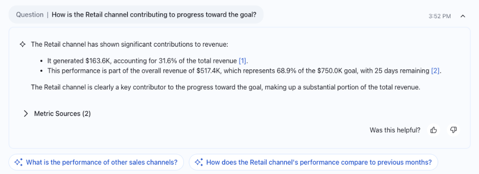 Get intuitive answers around set goals and thresholds from Tableau Pulse. Tableau Pulse uses frontier LLMs to detect patterns, highlight risks, and now, explain changes across multiple metrics relative to their set goals and thresholds. In addition to getting pacing context from the individual metric, business users can now ask questions and get responses, enriched with these insights.