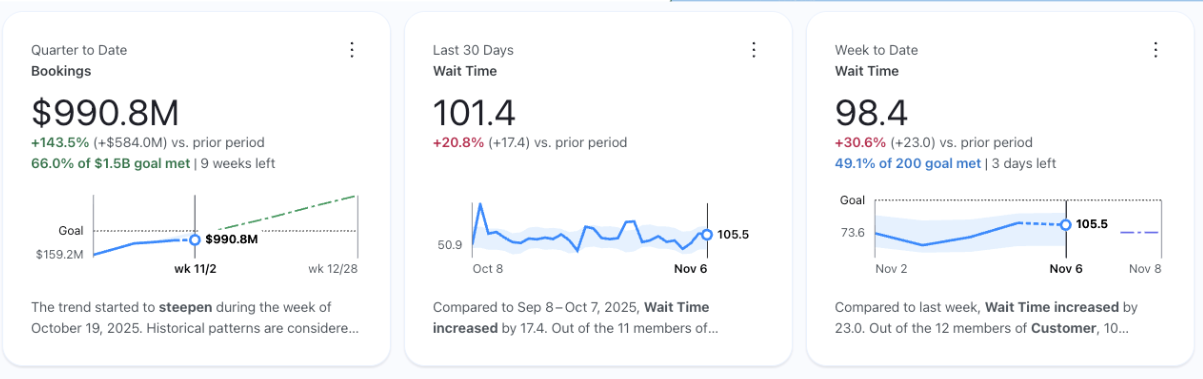 Quickly evaluate a Tableau Pulse metric based on pacing and historical context. Now business users can see both the metric's progress to a set goal and its performance relative to the prior period directly on the metric card. Instead of having to click into the metric details, users can obtain a fuller sense of the metric's performance directly from the Tableau Pulse home page.