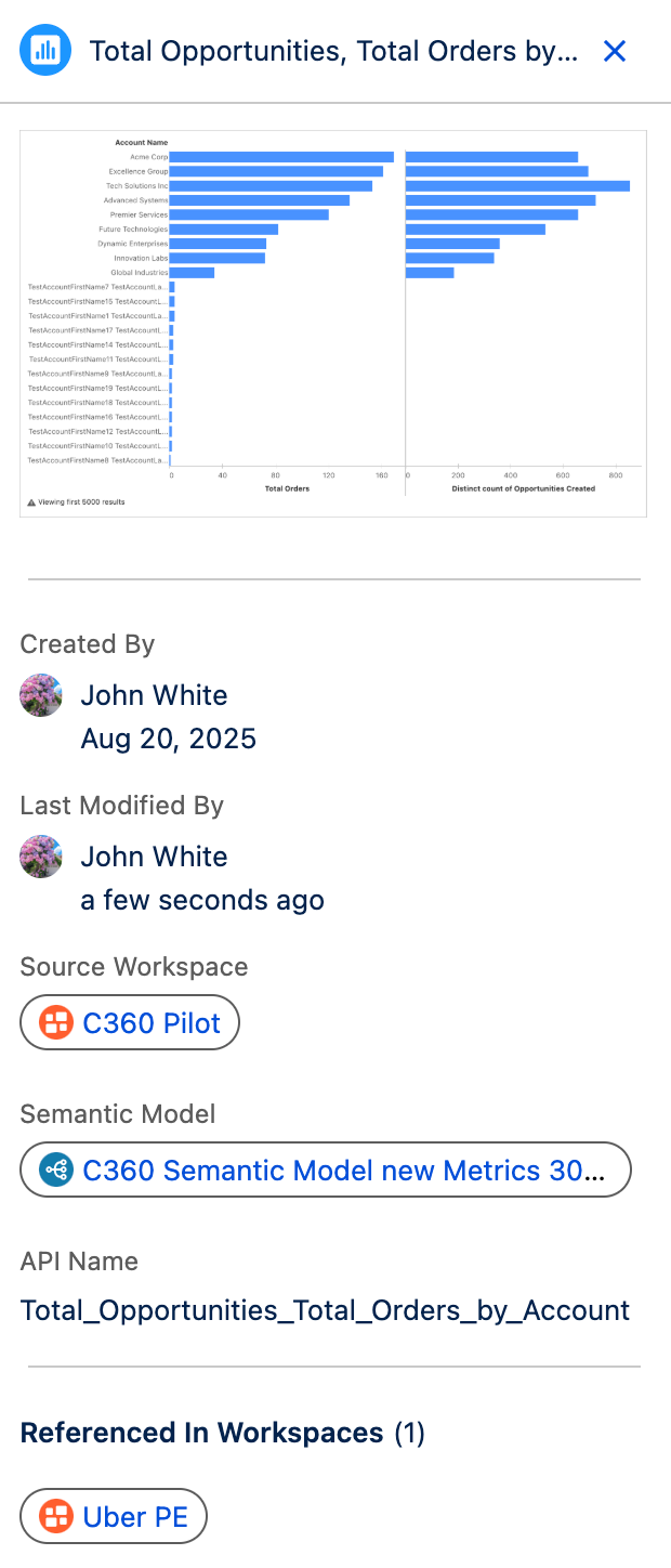 Assess asset usage and context within your organization's ecosystem without needing to open it. View assets such as thumbnails, workspaces, and semantic models directly in the Detail Panel. This brings clarity into how assets are being used and leveraged in the flow of work.