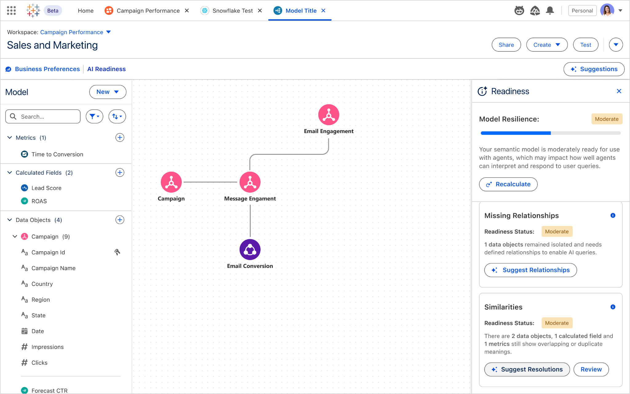Automatically generate a tailored semantic model based on a business goal, complete with relevant objects, relationships, and calculated fields. This accelerates semantic model creation and prepares your models to be AI-ready.