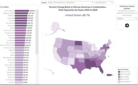 Released alongside the initial publication of the most recent decennial census results, the US Census Bureau has created several Tableau dashboards to make these data and insights easily accessible to anyone. Though these visualizations, viewers can explore data on the changing demographic trends at the federal, state, and county level.
