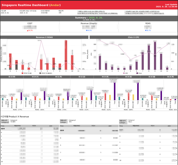 In performance marketing, real-time data monitoring is not an option but a necessity. During promotions or budget expansions, millions of won can be spent in an hour. If a landing page error or a sudden drop in media performance is detected even a few minutes late, it can lead to substantial losses. This was particularly challenging during weekends and holidays when budgets could be overspent or underutilized without immediate action.