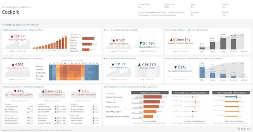 Today, interactive analytics with built-in AI help your staff confidently understand all customer data and service performance in their workflows, which helps them be more predictive and proactive when choosing how to act on behalf of customers. AI-powered analytics also fuel speed to insights for better contact routing, improved call center and field staff capacity, and automaton of more cumbersome, time-intensive processes. For example, a single dashboard displaying call center KPIs in Tableau can help management see and know where to optimize operations—from streamlining or eliminating multisystem dependencies to automating low-value processes that hamper productivity and communication. This frees up service staff to help more customers and address more complex cases.