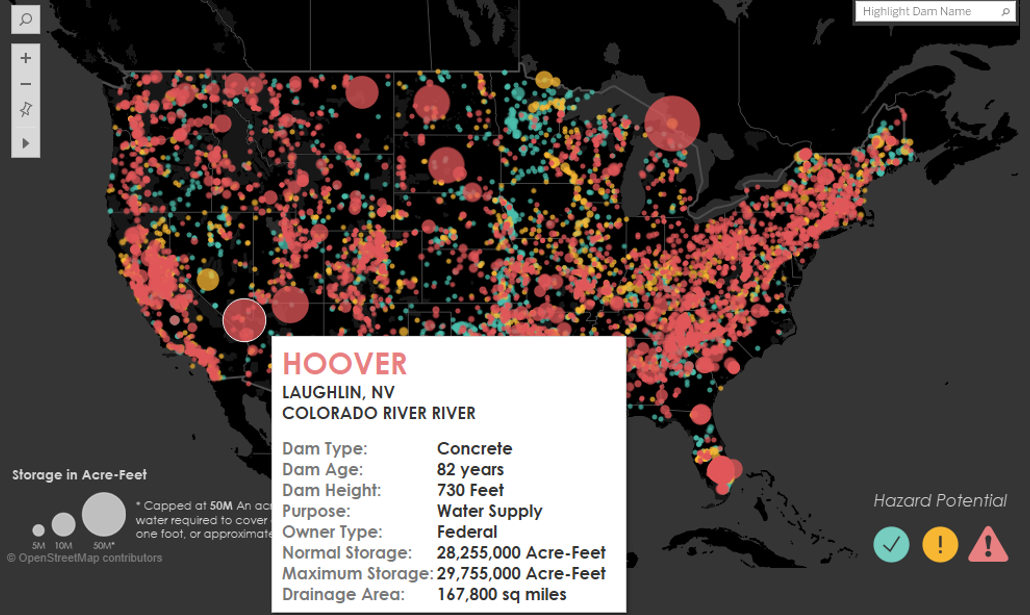 I decided to go with three main colors for the dashboard (relating back to the 3 hazard potential levels) and to make them pop I went with a dark dashboard (something I haven’t done in quite some time). For bubble size I went with “storage level”, which is measured in something called “Acre-Feet”. I had no idea what this was initially, but it turns out (thanks to wikipedia) that this is the amount of water to cover 1 acre of land in one foot of water (approx 326,000 gallons!). Actually, I ended up needing to throttle bubble size due to the dam at Lake Superior which had 9.7 BILLION Acre-Feet of storage (just an FYI, thats 3.1 TRILLION gallons of water). I made the cutoff 50M Acre-Feet, which looked good visually.