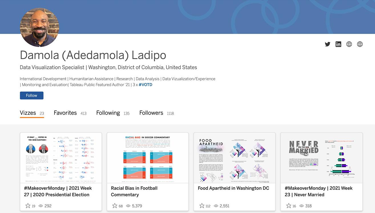 View the new-and-improved profile pages, or customize your own, by signing in to Tableau Public. If you don’t have a Tableau Public profile, create one for free. Stay tuned for more improvements!