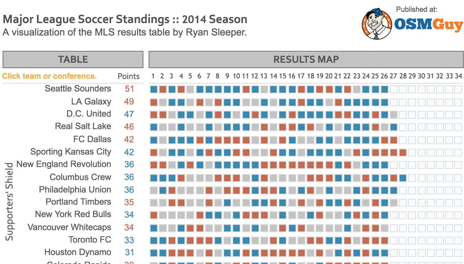 For this reason, I took my own shot at reinventing Major League Soccer standings two years ago. Here was my first attempt at visualizing sports standings: