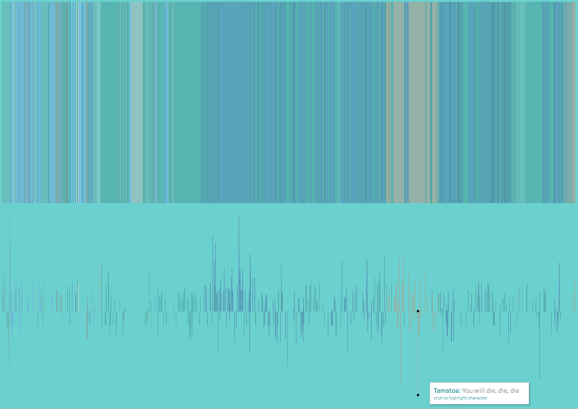 I didn’t end up including this in the published version on Public, but here is another view of the Moana script unit chart with corresponding sentiment (via Brit’s python script) below. Tamatoa is a pretty negative crustacean…