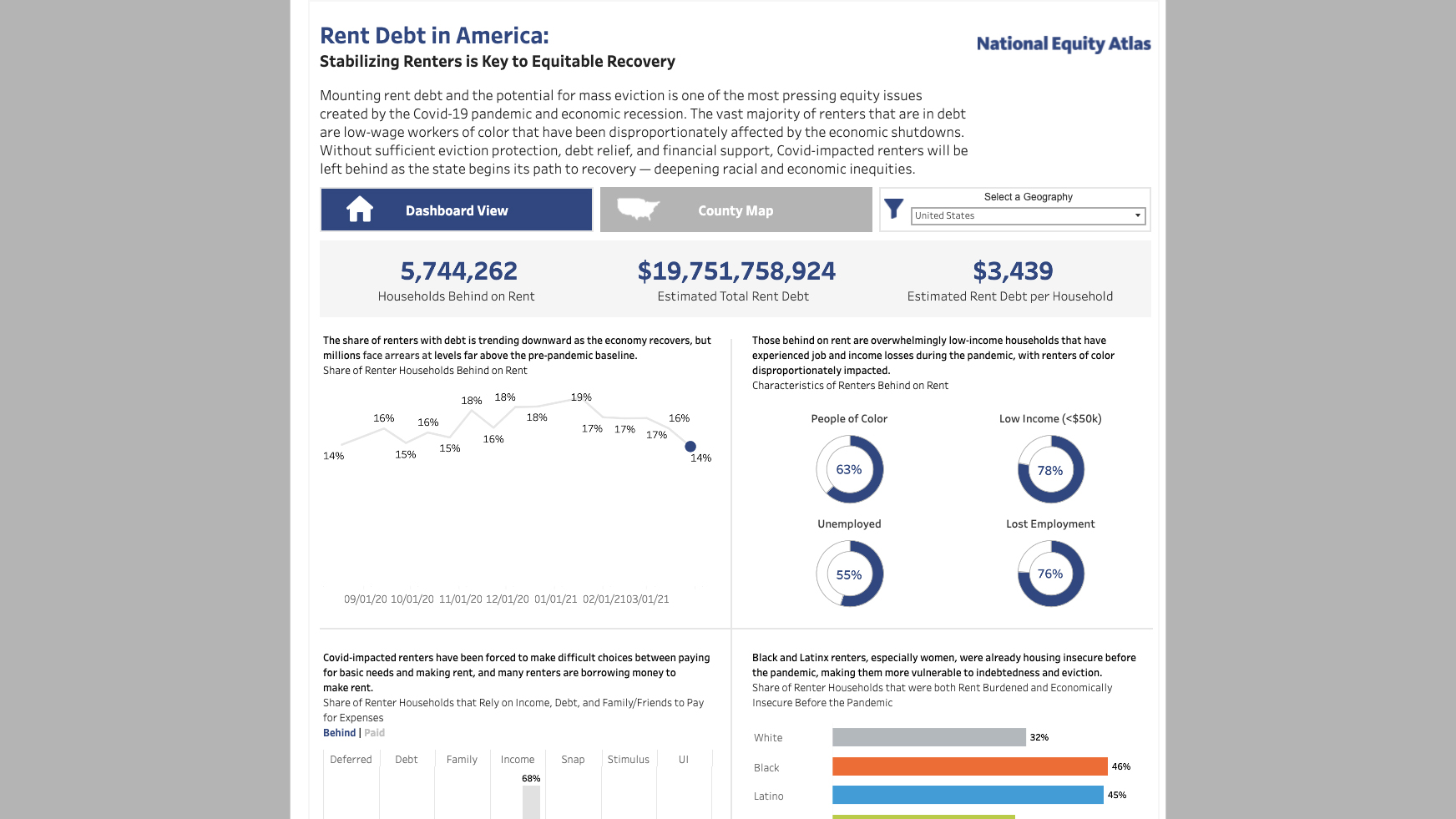 The National Equity Atlas, a collaboration between PolicyLink and the University of Southern California Equity Research Institute, has partnered with the Right to the City Alliance national housing justice network to develop an interactive dashboard providing a broad overview of rent debt in America. The dashboard features trend metrics on percentage of renters who are in arrears, estimated debt averages, and demographic details including the percentage of renters who are people of color, low income, and whether renters are experiencing unemployment or have lost employment income. There are also metrics that indicate the share of renter households both rent burdened and economically insecure, pre-pandemic.