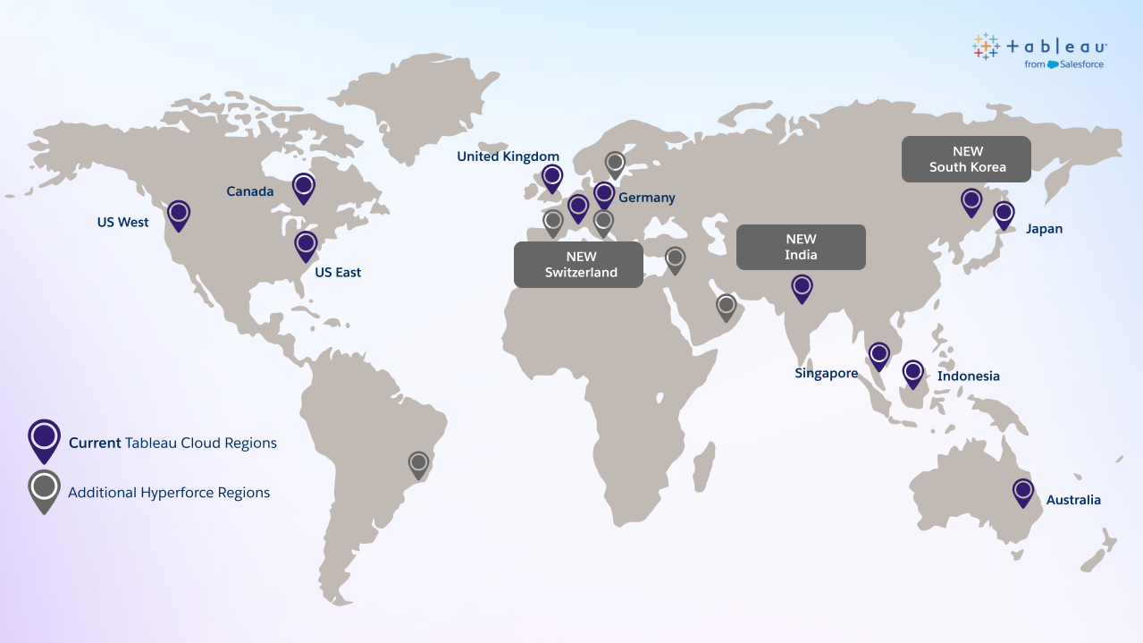 - リージョンの拡大: Tableau Cloud は、ヨーロッパのリージョンとして最もご要望の多かった Hyperforce ドイツリージョンに、またアジアでもシンガポールリージョンとインドネシアリージョンに対応しました。