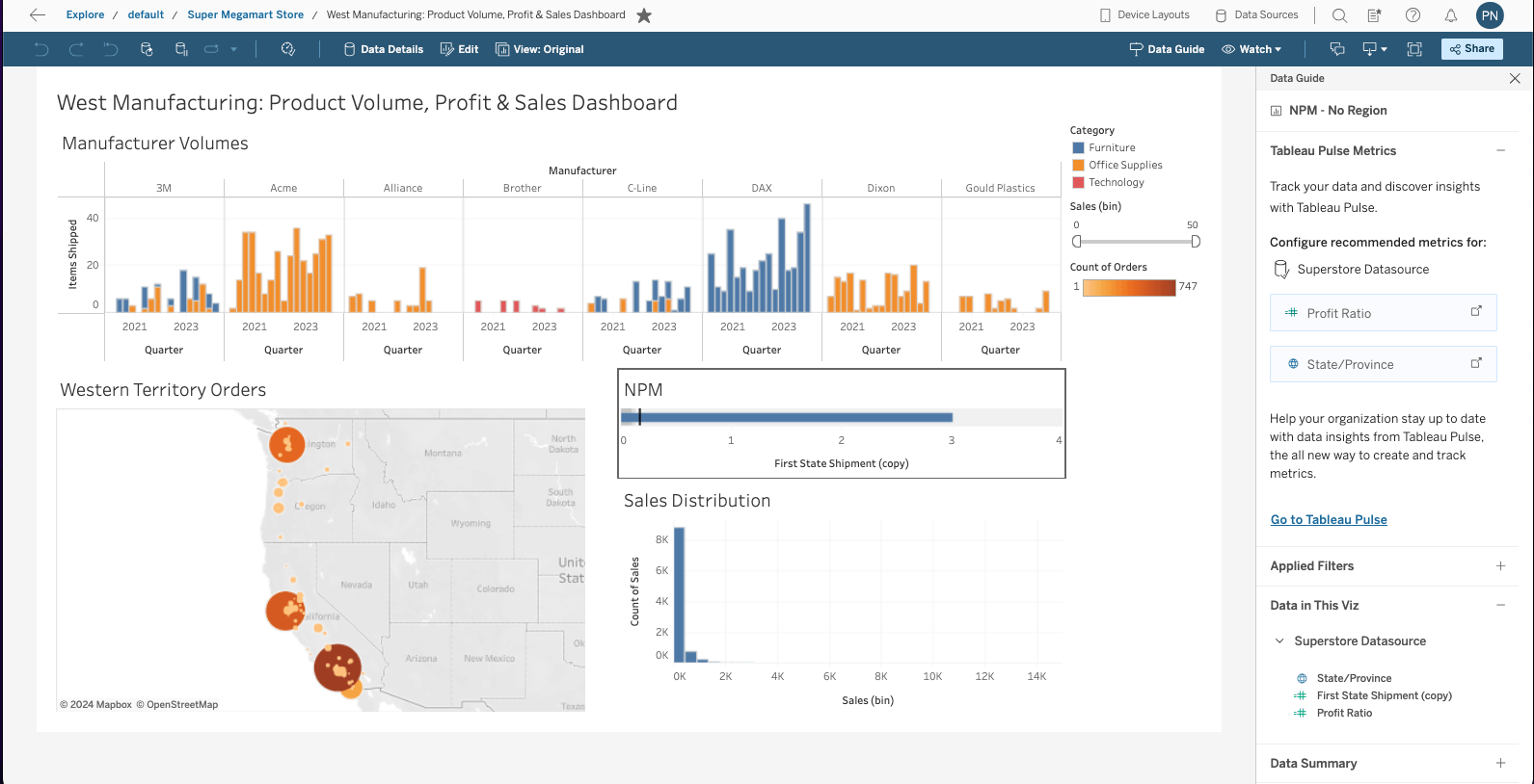 Tableau データガイドのスマートなヒューリスティクスと詳しいコンテキストを使って、ダッシュボードのビジュアライゼーションに隠れている Tableau Pulse メトリクスを発見することができます。今回のリリースでは、Tableau ビジュアライゼーションの主なタイプ (棒グラフ、面グラフ、折れ線グラフ) で重要なメジャーとディメンションを識別するヒューリスティクスが強化されました。また、パブリッシュされたデータソース (PDS) 内の計算フィールドが認識されて含められるようになったほか、メジャーとディメンションのアイコン表示も強化されています。