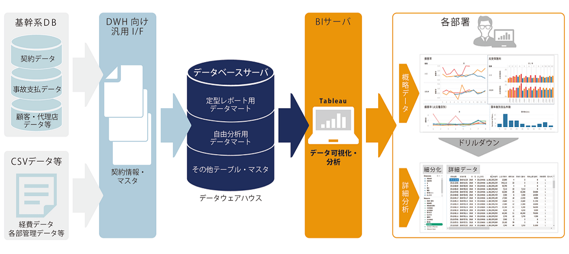 このプロジェクトではまず、分析対象のデータを集約するデータウェアハウス (DWH) を構築。ここに、保険契約データや保険金支払いデータ、経理データなど、経営分析を行うために必要な複数の基幹系データを、日次で抽出する仕組みを作り上げました。さらにそのデータを加工し、用途毎に Tableau 用データマートを作成。これらを Tableau 10.5 からサポートしている 「.hyper」 形式で Tableau Server に取り込み、インメモリ型で分析できるようにしました。