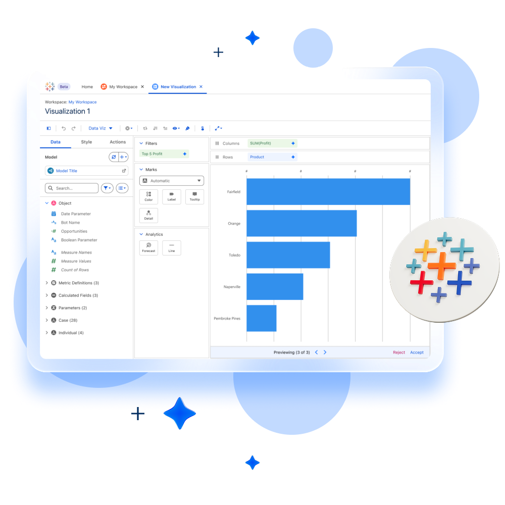 With Tableau Server or fully-hosted Tableau Cloud, author visualizations, find insights, share them with teammates, and make critical decisions.