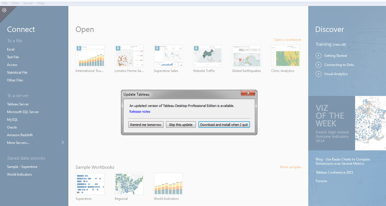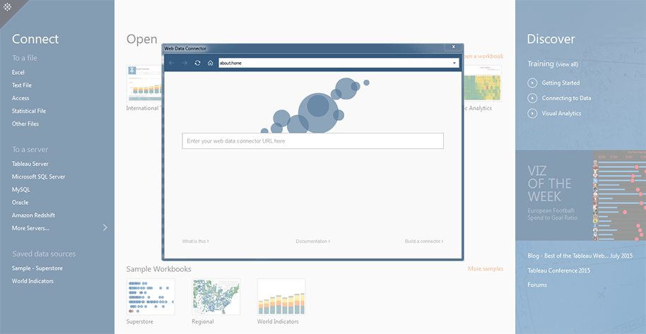 You can now customize the Discover Pane that appears on the start page in Tableau Desktop to show your own custom content instead of the content Tableau shows by default. Provide links and information specific to your organization to make it easier for your users to get started using Tableau quickly. Learn more about it here.