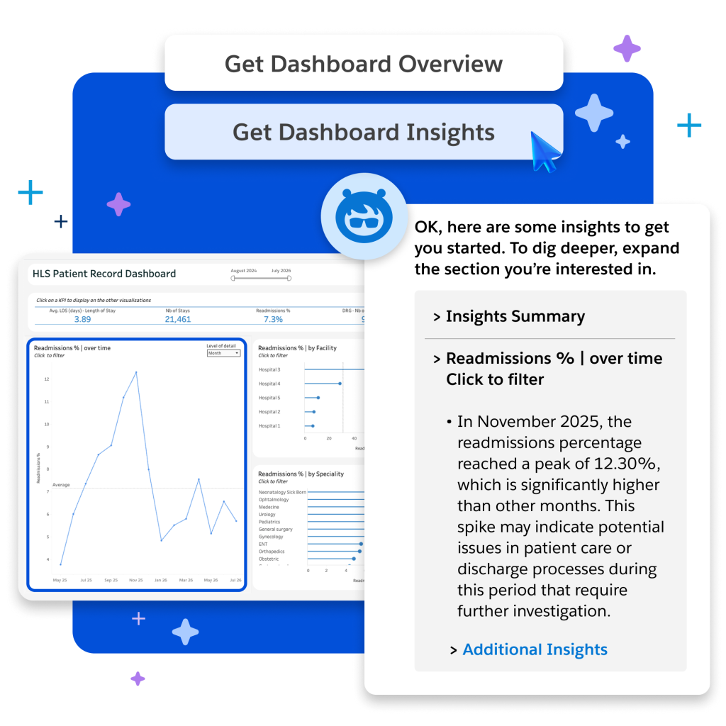 Ease data discovery and quickly identify important trends. Tableau Agent helps you pinpoint the dashboard relevant to your questions with a concise overview and provides clear explanations of each viz that highlight key insights and trends.