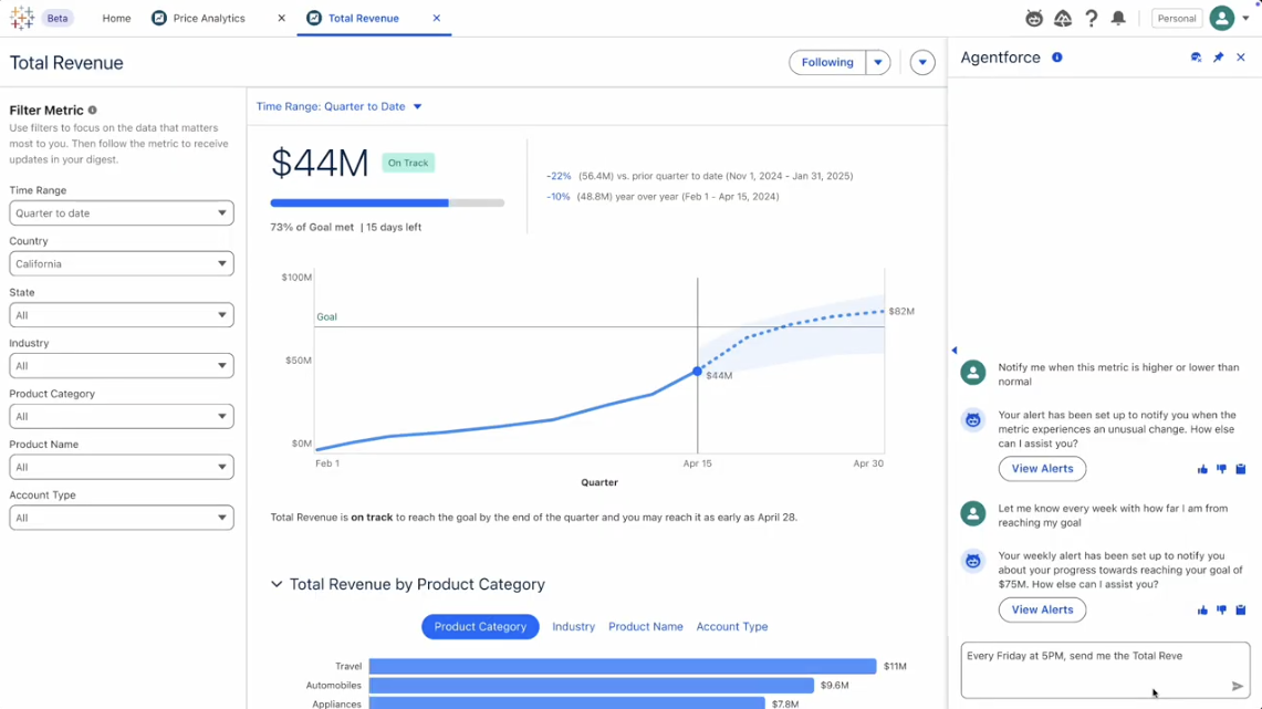 Get intuitive answers around set goals and thresholds from Tableau Pulse. Tableau Pulse uses frontier LLMs to detect patterns, highlight risks, and now, explain changes across multiple metrics relative to their set goals and thresholds. In addition to getting pacing context from the individual metric, business users can now ask questions and get responses, enriched with these insights.