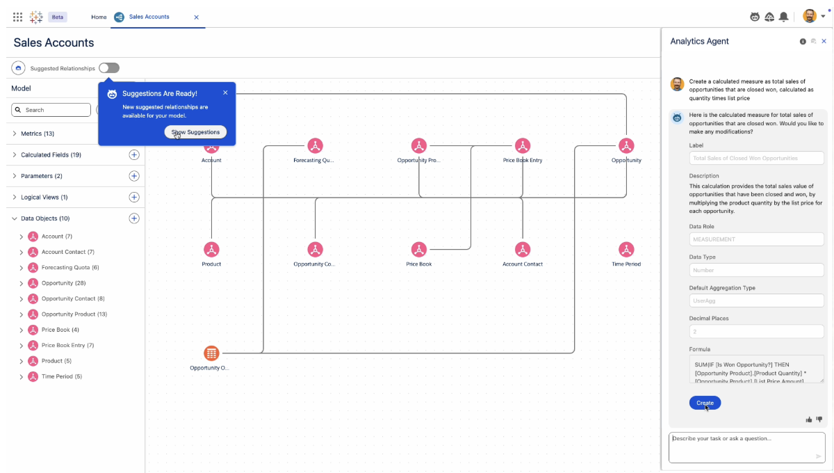 Automatically generate a tailored semantic model based on a business goal, complete with relevant objects, relationships, and calculated fields. This accelerates semantic model creation and prepares your models to be AI-ready.