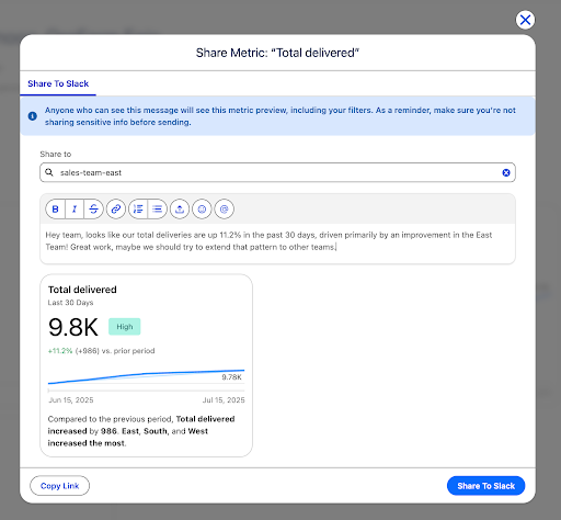Instantly determine whether a Tableau Pulse metric is on pace to meet a set goal by the end of the period. When users click into the metric details, they will see the metric labeled as either 'On Track' (in green) or 'Off Track' (in red). At the chart level, users get a written progress summary and the explanatory chart, color coded to indicate pacing status. With this additional insight, business users can better prioritize their time and make smarter decisions, faster.