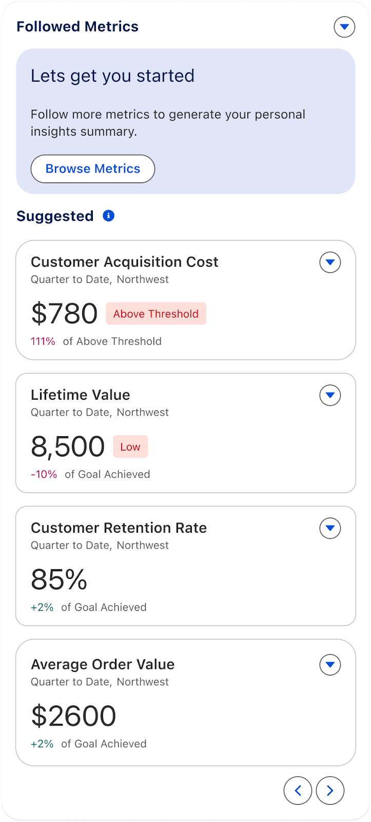 Quickly evaluate a Tableau Pulse metric based on pacing and historical context. Now business users can see both the metric's progress to a set goal and its performance relative to the prior period directly on the metric card. Instead of having to click into the metric details, users can obtain a fuller sense of the metric's performance directly from the Tableau Pulse home page.