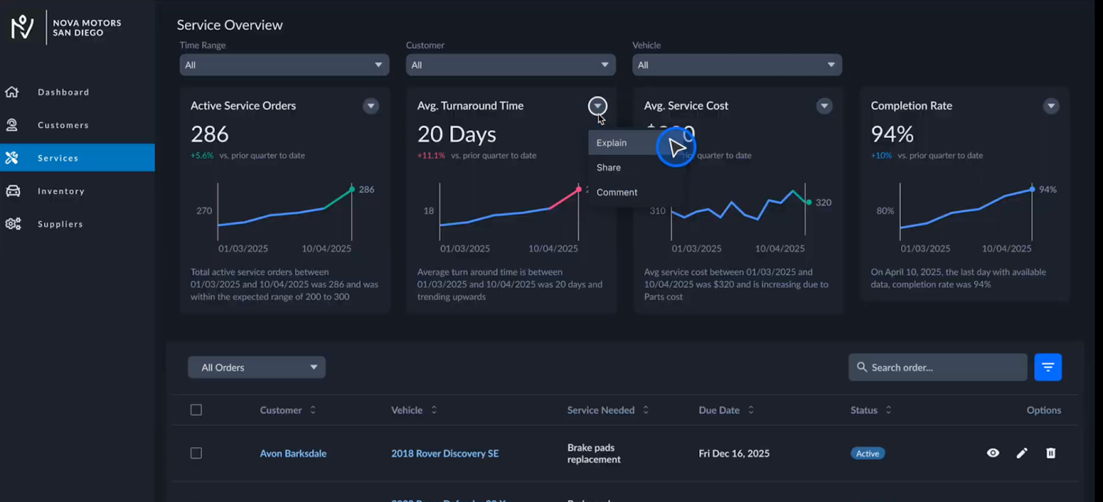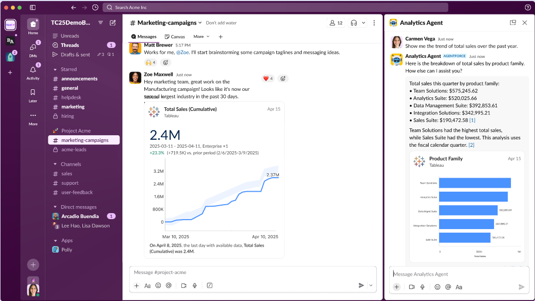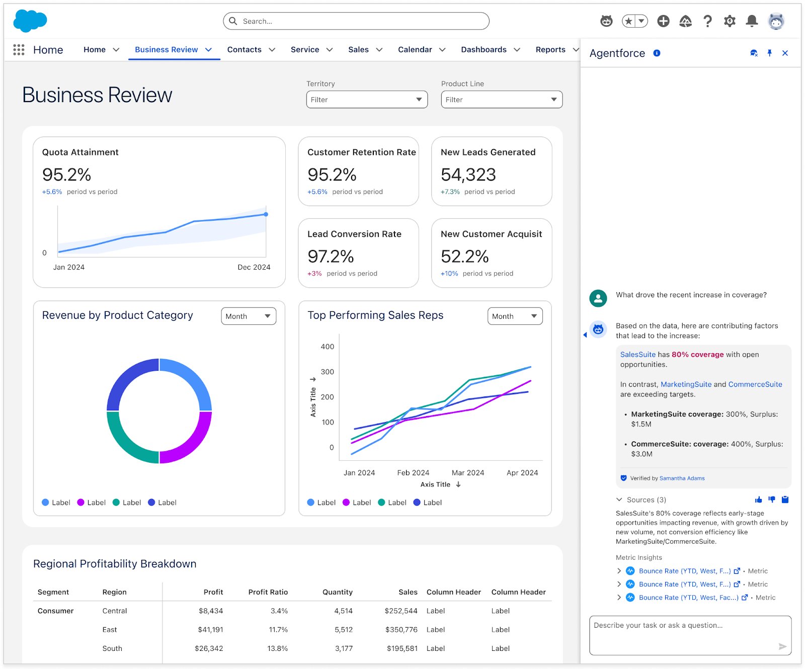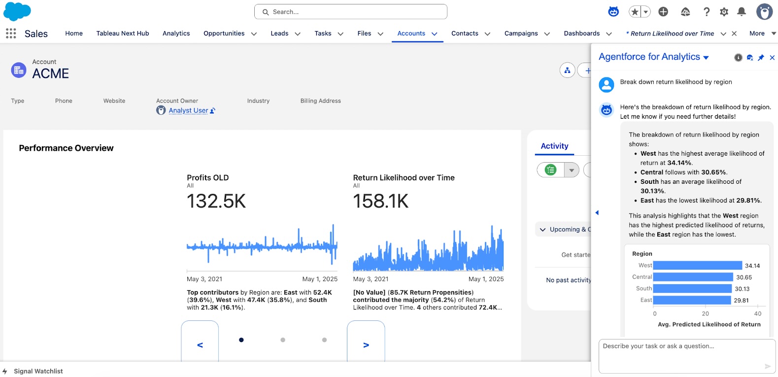 Enable conversational analytics in the flow of work with Concierge in Lightning. The agent will automatically inherit all context (like filters and data sources) from your embedded Tableau Next dashboard, so you can ask plain-language questions and get accurate responses without leaving your workflow.