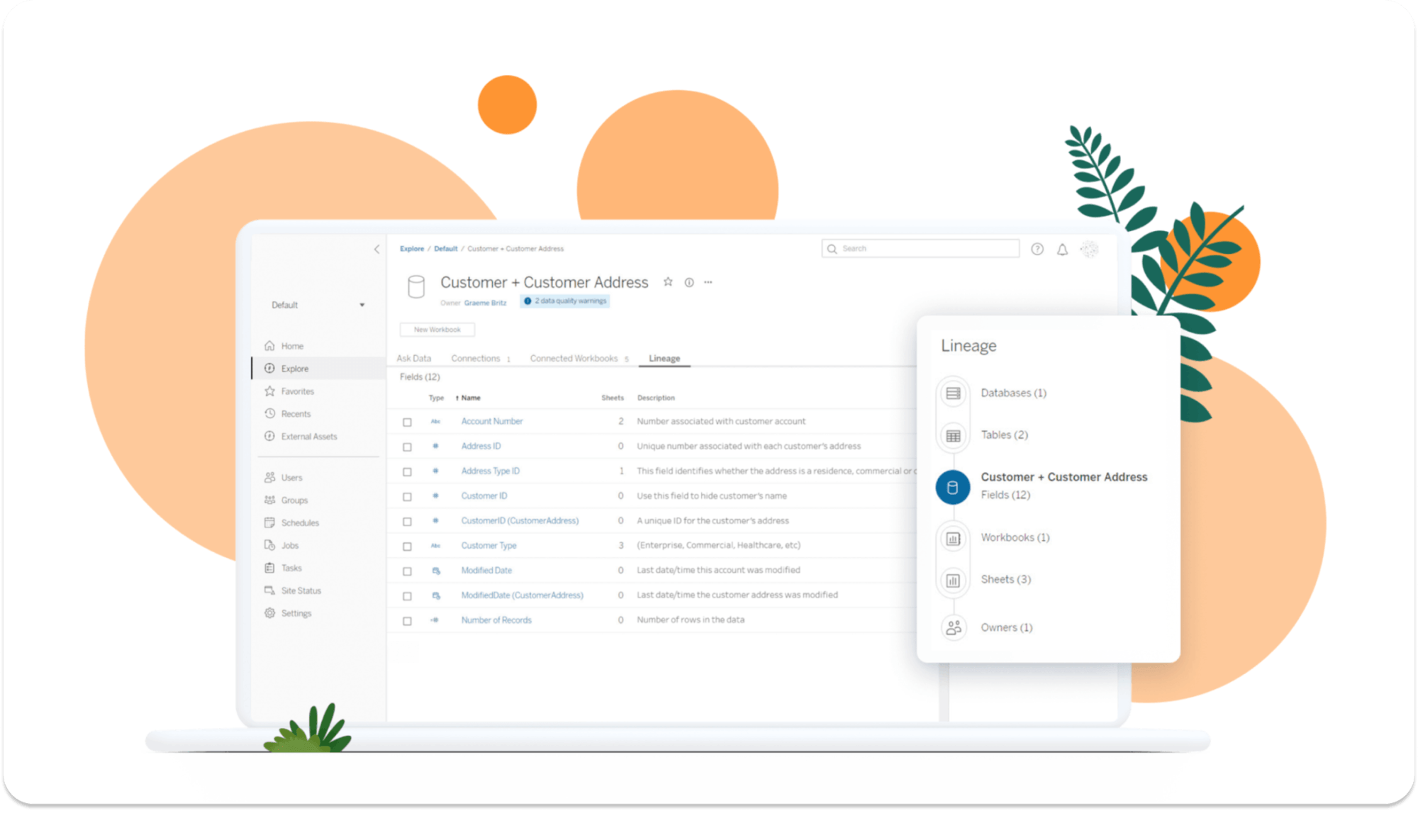 Data management capabilities activate a set of premium data functions for Tableau. This includes an analytics data catalog, flow management, and other data governance and security controls. Data management helps drive trust across Tableau deployments by surfacing critical metadata such as certifications, warnings, and definitions directly in the analytics experience. Available with Enterprise and Tableau+.