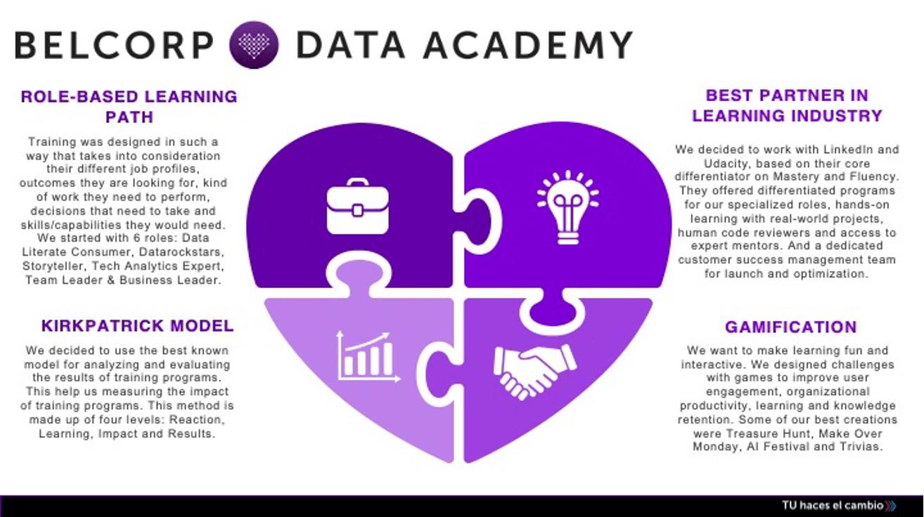 To create the Data Academy, Gopalan and the Business Intelligence team looked for benchmarks in the market, and established partnerships with key education leaders to design a program that catered to Belcorp’s needs.