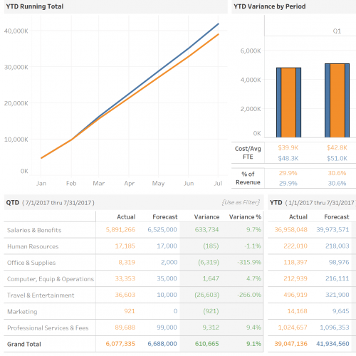 This dashboard enables executives to understand how their business is performing compared to the projections set at different times during the fiscal year.