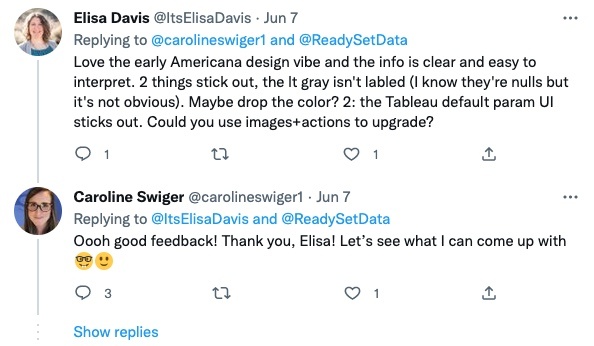 Another key piece of this journey was making a public commitment to give #B2VB feedback on Twitter. I really enjoyed the feedback element of #MAD and seeing how many different ways there are to interpret the same data, even with the same set of requirements. As I was scrolling through #B2VB entries for inspiration, I noticed that some people were brave enough to write “feedback welcome” and had gotten zero comments.