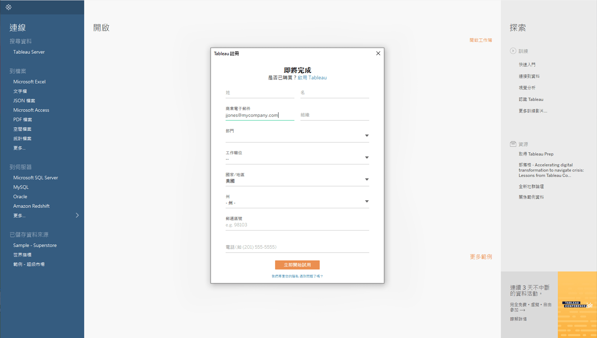 安裝完成後,按一下以開啟 Tableau Desktop。填妥試用版註冊表單並按一下「提交」以啟用您的免費試用版。
